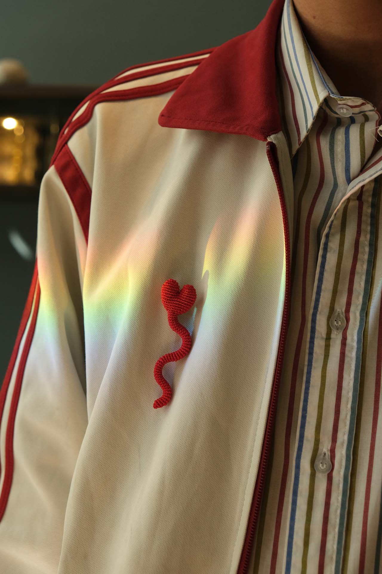 Le travail de Felieke van der Leest déploie un univers joyeux et débridé où les animaux se transforment en personnages hauts en couleur. Elle combine crochet, textile, métaux précieux et jouets en plastique pour créer des figures hybrides, ludiques et expressives. Entre humour, narration et délicatesse, ses bijoux abordent aussi des thèmes plus graves comme l’environnement ou notre relation au vivant. Chaque pièce devient un petit théâtre où l’enfance, le jeu et la critique sociale s’entrelacent avec finesse.