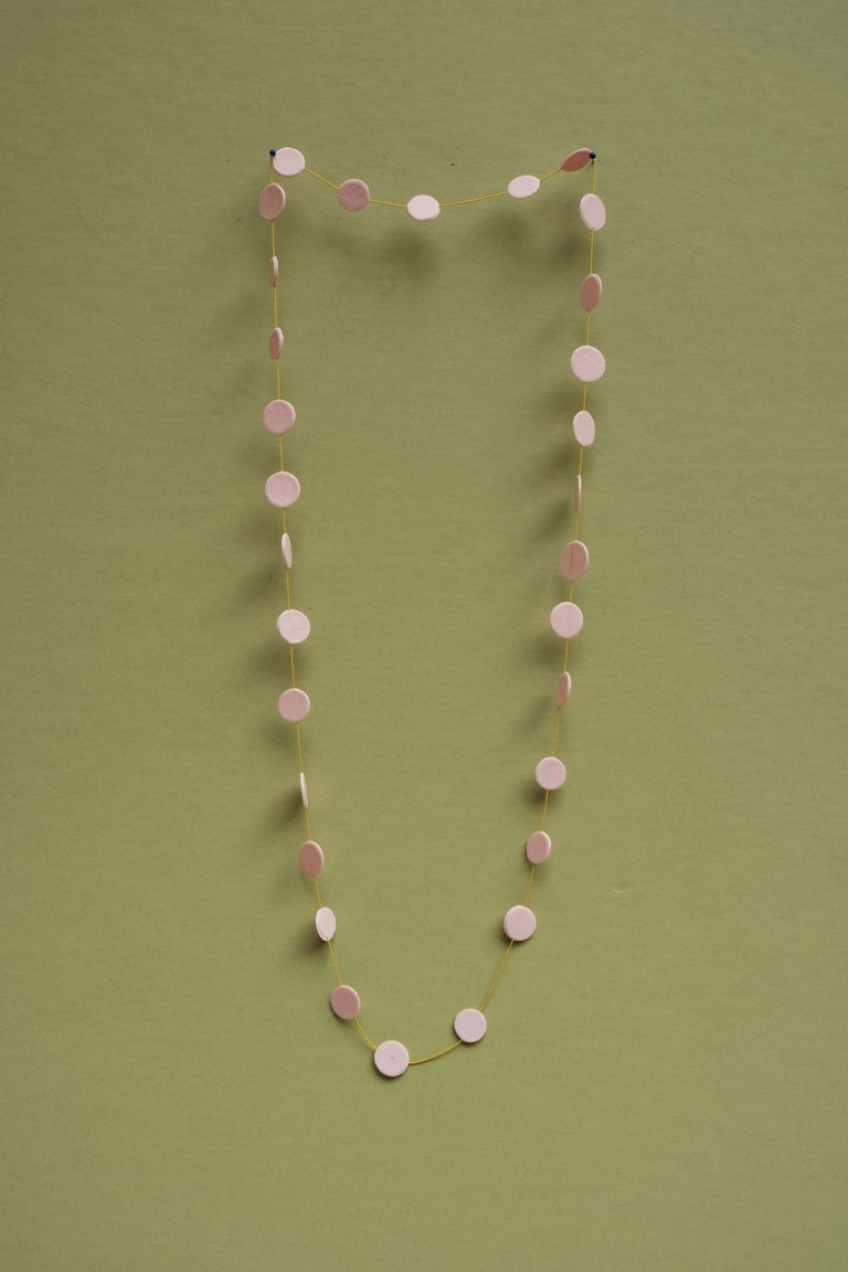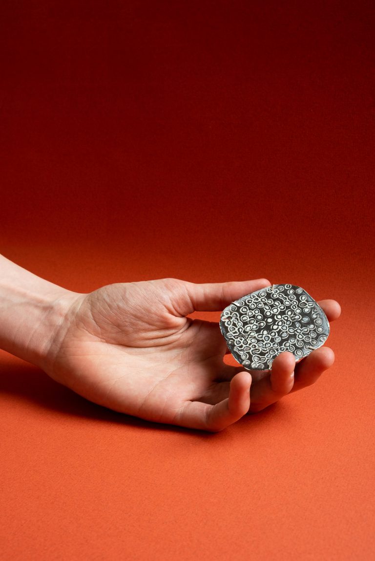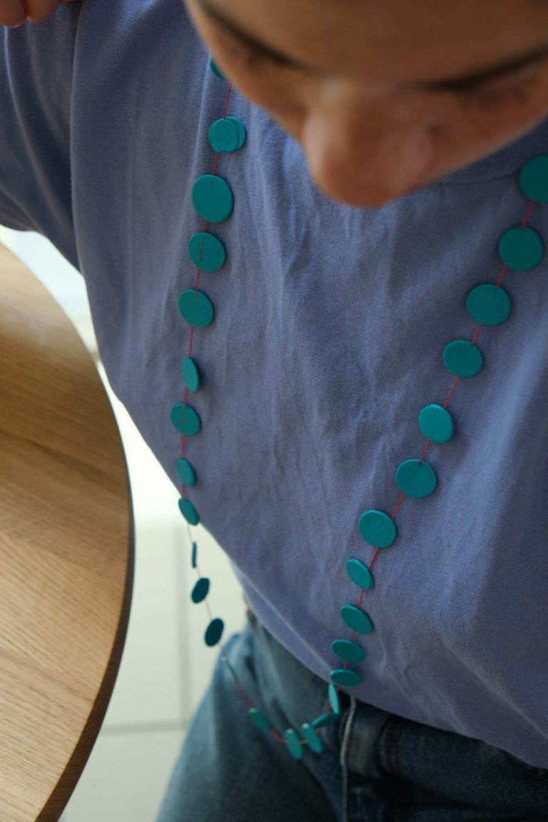 Loet Gescher qui vit et travaille à Maastricht, transcende l’idée du plastique recyclé en créant des bijoux légers et colorés, parfois encore odorants. Elle explore la matière, se l’accapare et parvient à nous faire oublier son usage premier. Une broche se pose, un fil de soie constellé de pastilles danse au gré du mouvement, le collier se porte sans pesanteur avec beaucoup d’élégance.