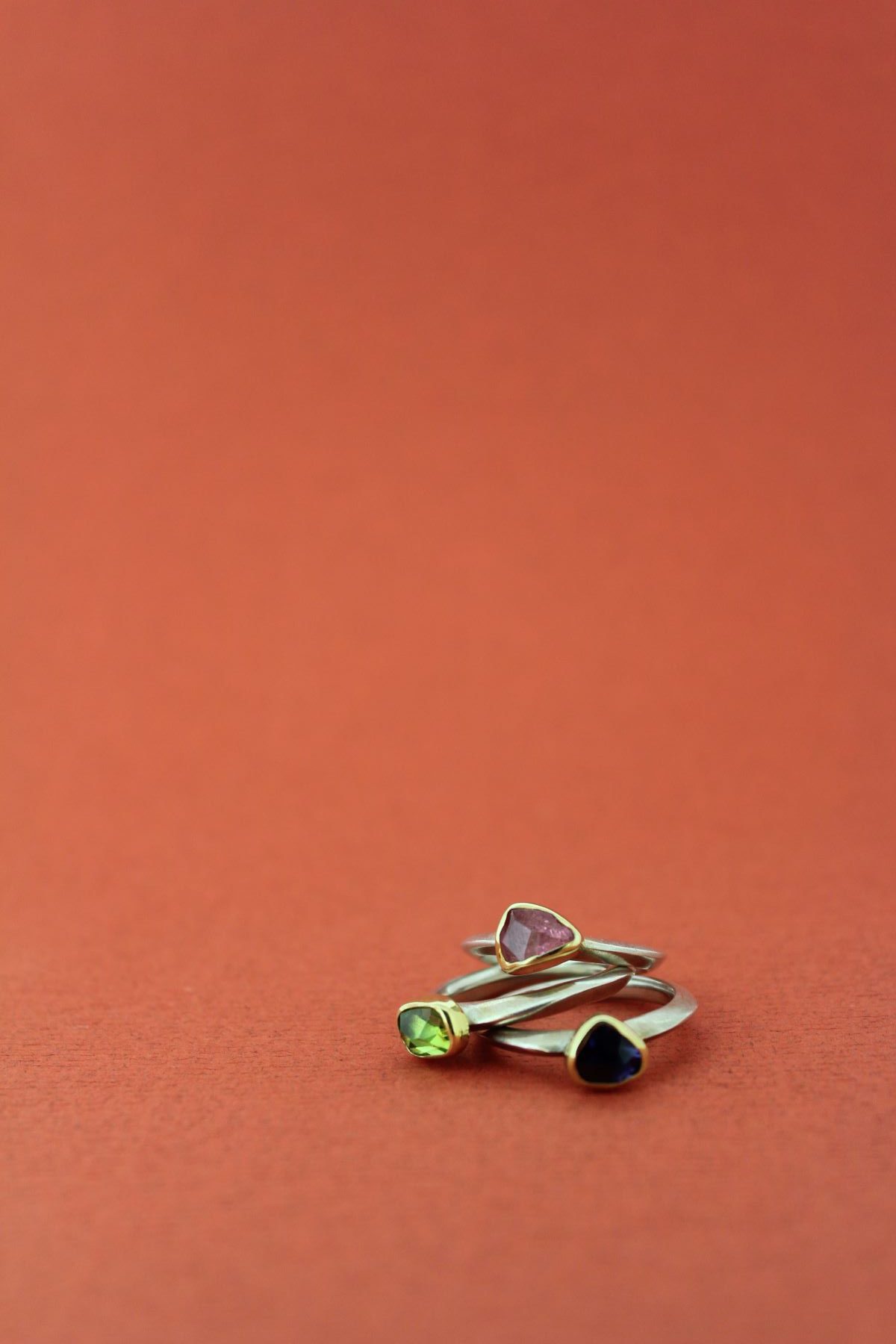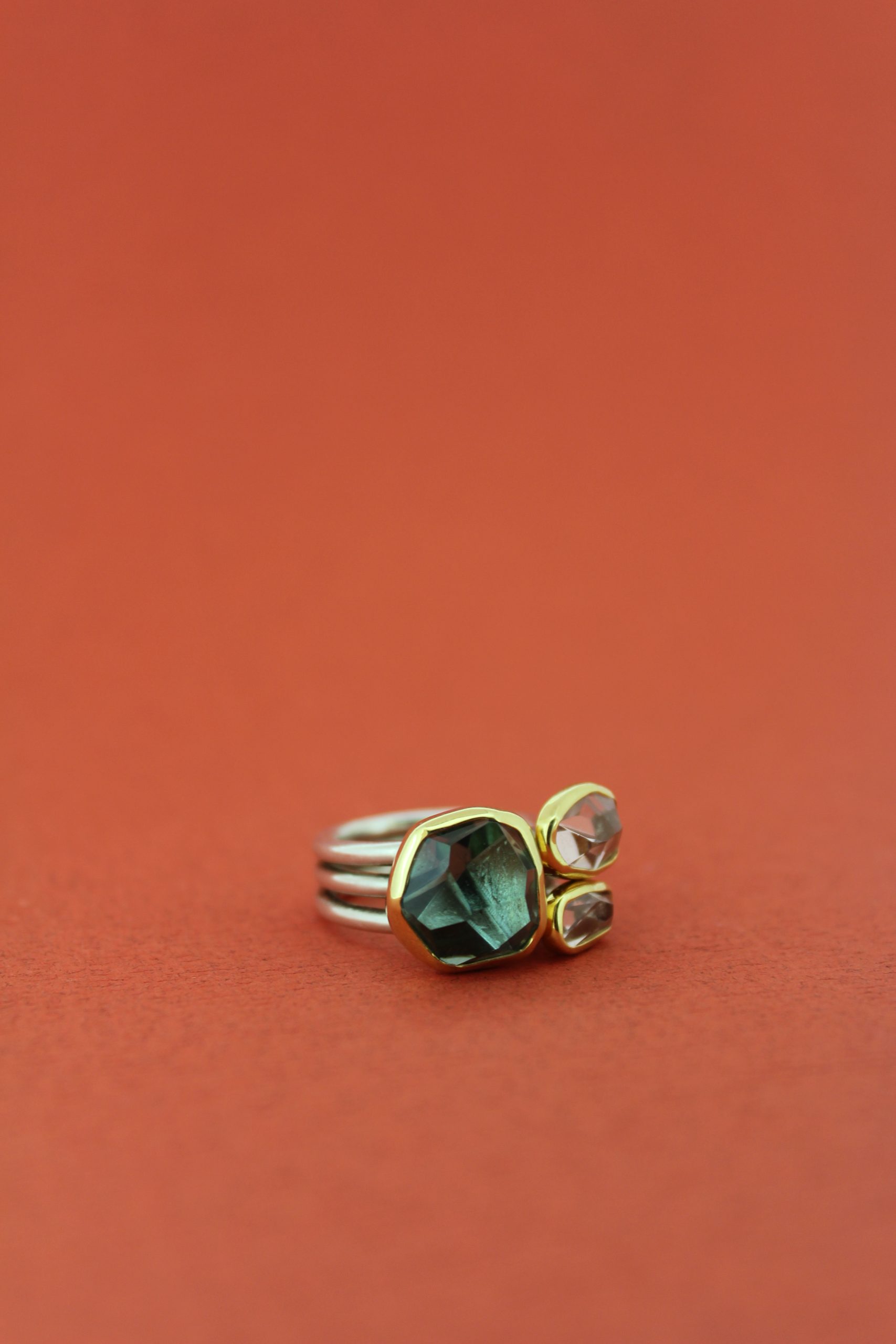 Dans leur atelier, les pierres sont au centre du processus créatif. Mary se concentre sur le design, imaginant des formes libres et modernes, tandis que les techniques de taille et de polissage sont le domaine d’expertise de Yannis. Certaines pierres, laissées à l’état brut, révèlent une texture naturelle, alors que d’autres sont façonnées en coupes libres pour capturer la lumière de façon unique. Les métaux précieux comme l’or 18 carats et l’argent sterling encadrent ces gemmes, ajoutant contraste et sophistication.