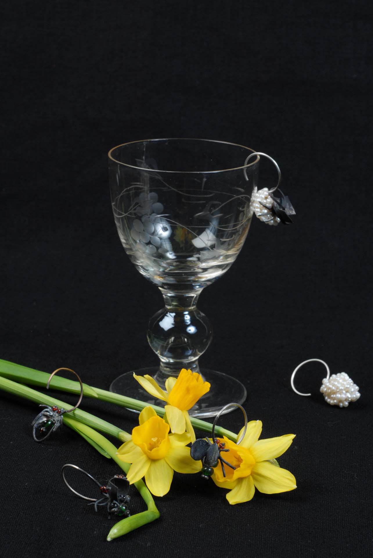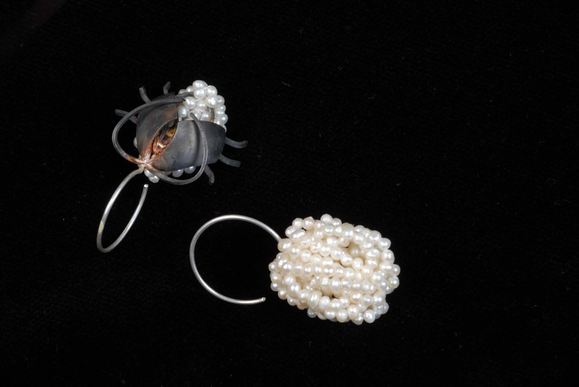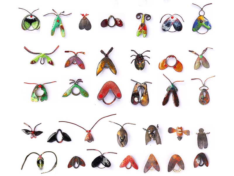 Monika Brugger nous entraîne dans un jardin foisonnant de mouches, ces vanités qu’elle affectionne pour leur ambivalence : séduisantes, agaçantes, répugnantes. Ses colliers, d’abord perçus comme des assemblages poétiques de perles colorées en grappes ou en rangs, révèlent soudain une nuée d’insectes aux antennes démesurées. Entre surprise et déstabilisation, l’artiste joue de nos émotions pour interroger le rapport entre beauté, répulsion et illusion. Fidèle à sa démarche conceptuelle, elle explore l’imbrication intime du bijou avec le corps, la matière et le langage.