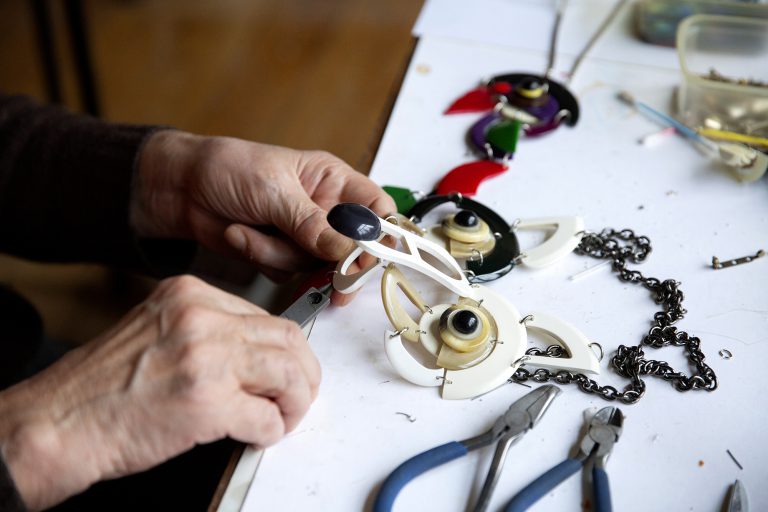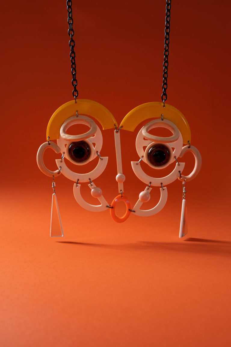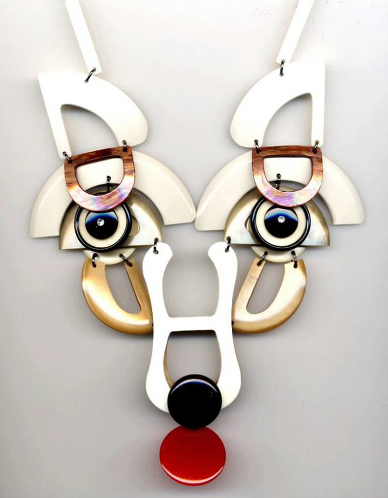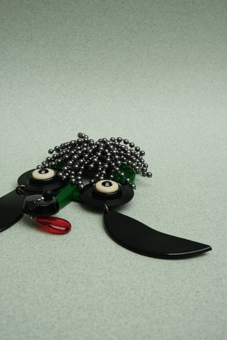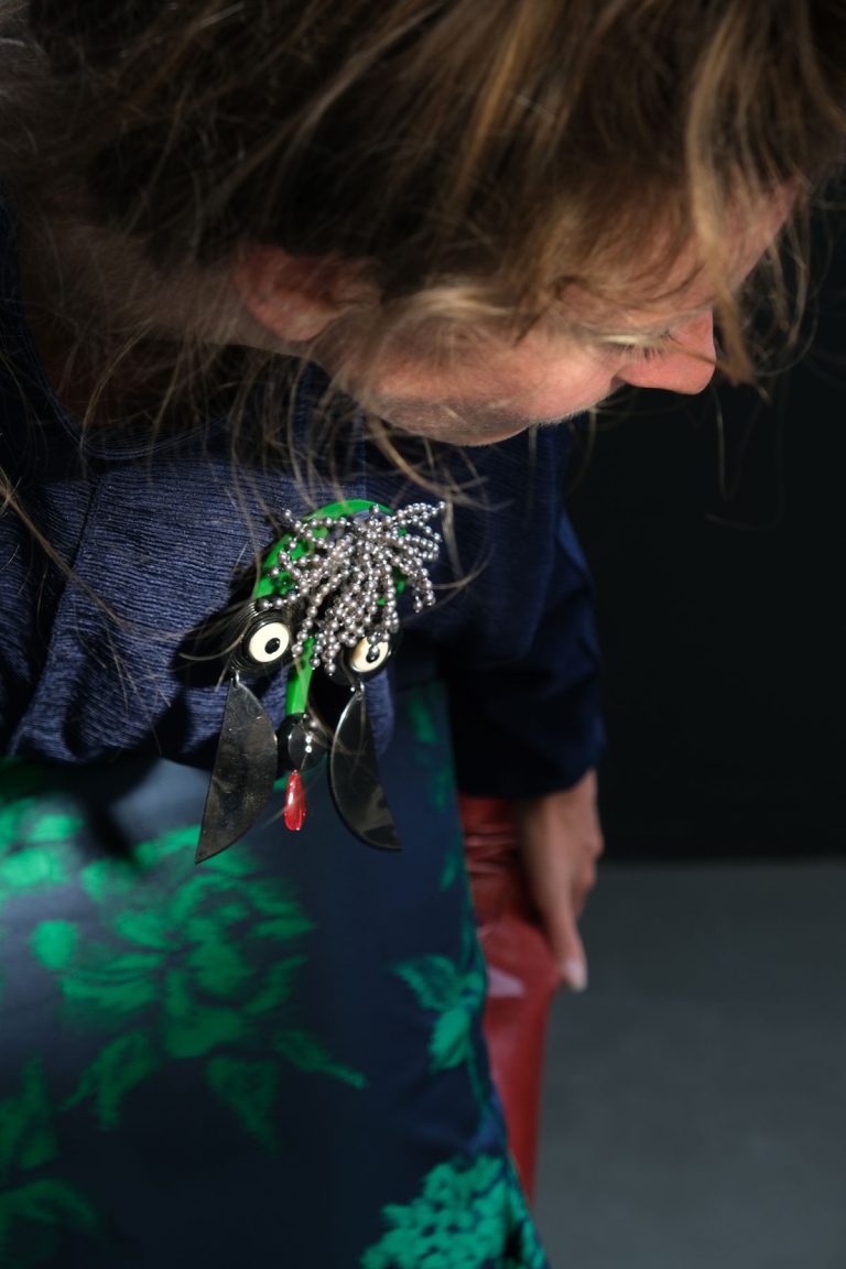 Jacqueline Lecarme is a bit of an outsider in her field. With a background in drawing and painting, she flirts with fashion and in particular its accessories, sources of inspiration as much as raw materials that she assembles according to her imagination. From her hands are born sculptural objects to be worn, where humour is the key to her creativity. Tenderness is called for when the eyes discover the shape and fall under the spell.