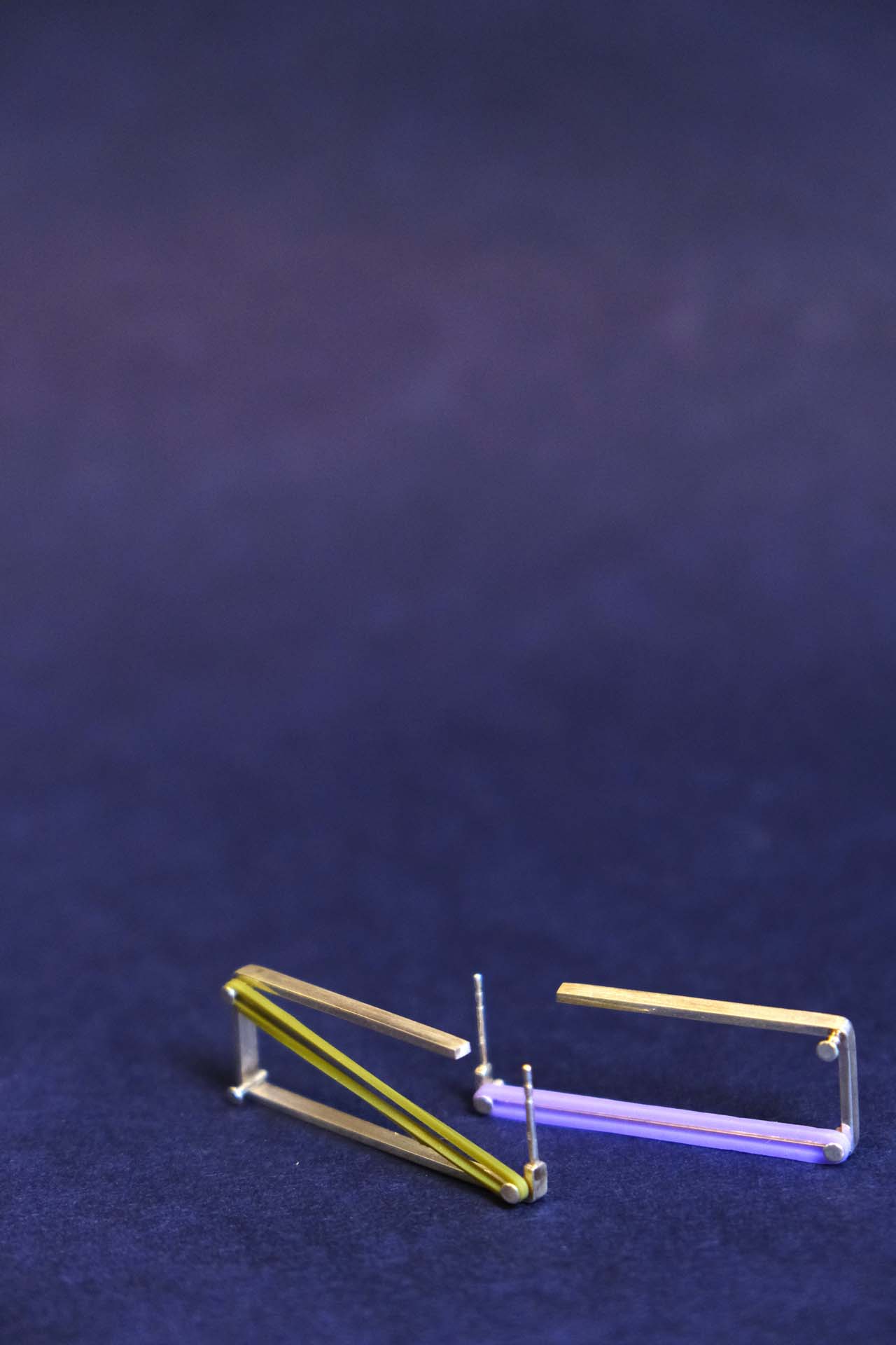 Exploring the concept of tension, constraining a flexible and elastic material, giving it shape. Extension is a collection combining the flexibility of rubber with the rigour of silver. Geometric, unique and playful pieces. Six elastic bands, six colours, a multitude of shapes.
