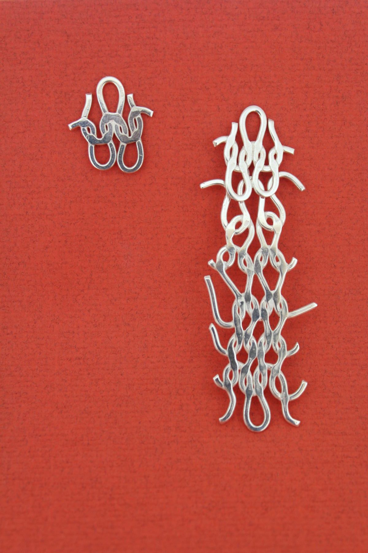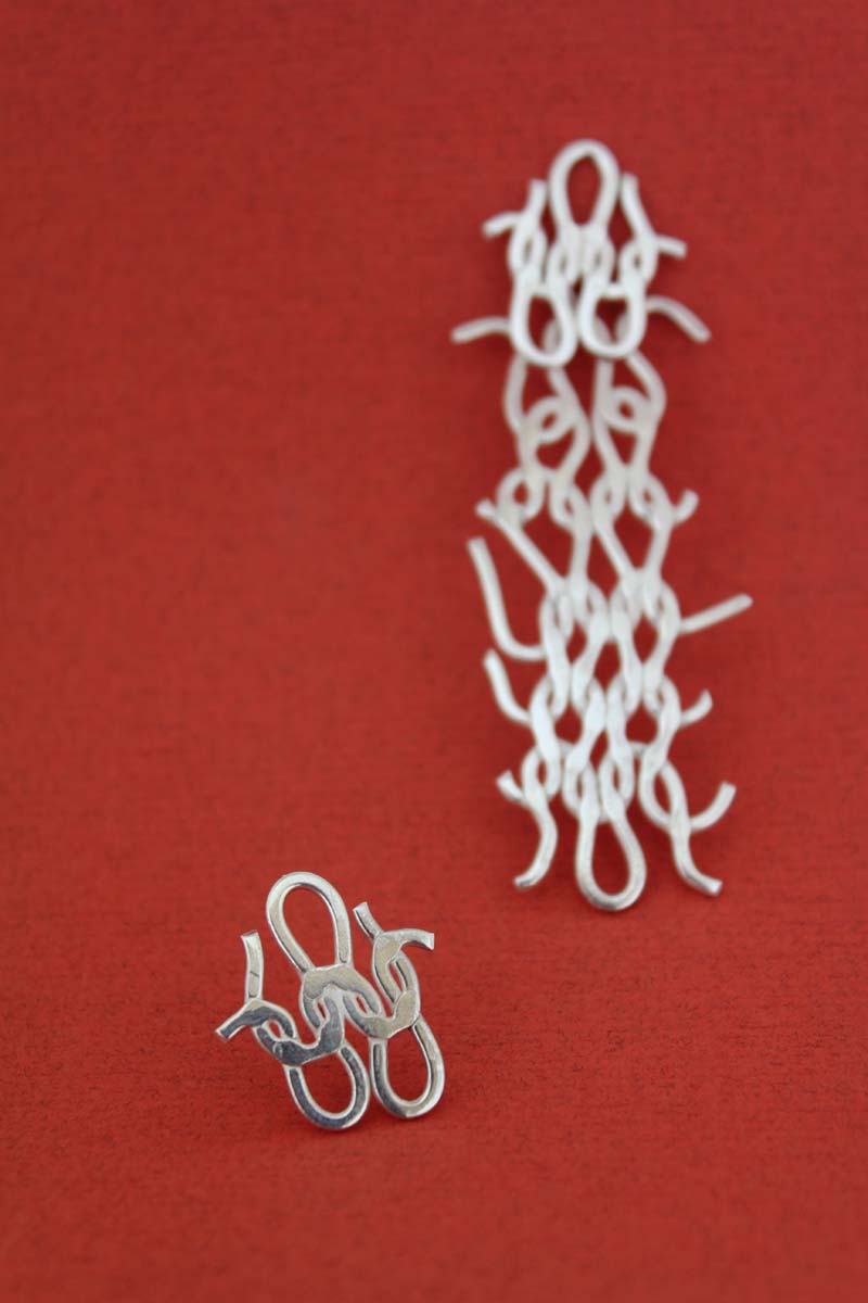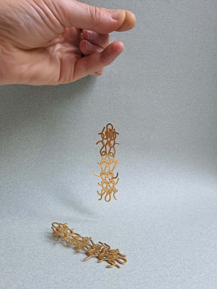 Inspired by textile techniques such as knitting, basketry and weaving, the artist presents us with airy, flowing brooches and earrings.