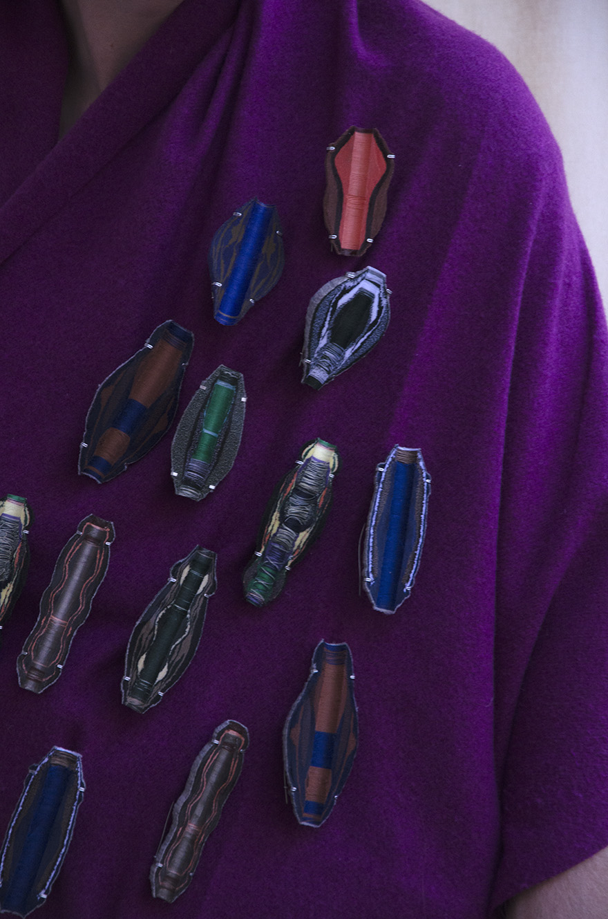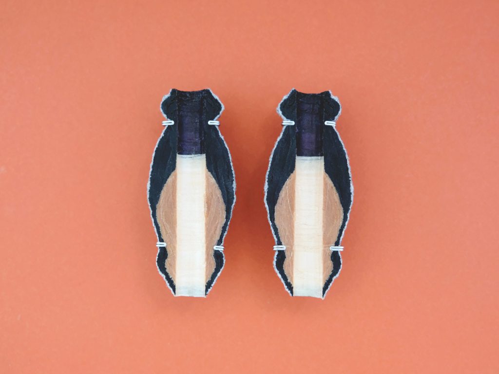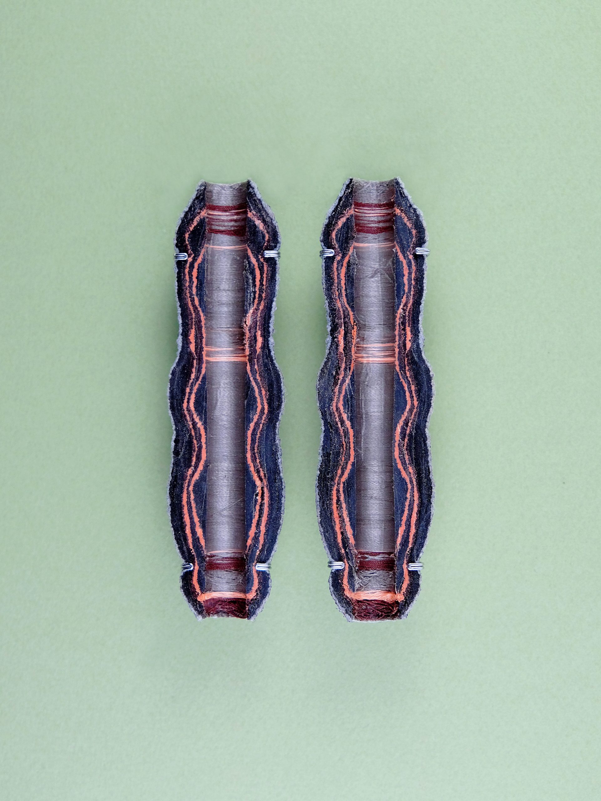 Attachées à l’observation des gestes, du territoire, des techniques textiles ou de la reliure, elles créent des bijoux sensibles où la couleur, les rythmes, le mouvement prennent une place vitale ; allant jusqu’à laisser apparentes les strates de leur fabrication ou la trace d’un vécu. Ellis, Comme un après-midi, les Rebuts, celles qui s’exaltaient, Incision, Sillon : leurs créations empreintes d’histoires s’attachent à la relation entre bijou, corps et vêtement, et à la tension entre le porteur et le spectateur.