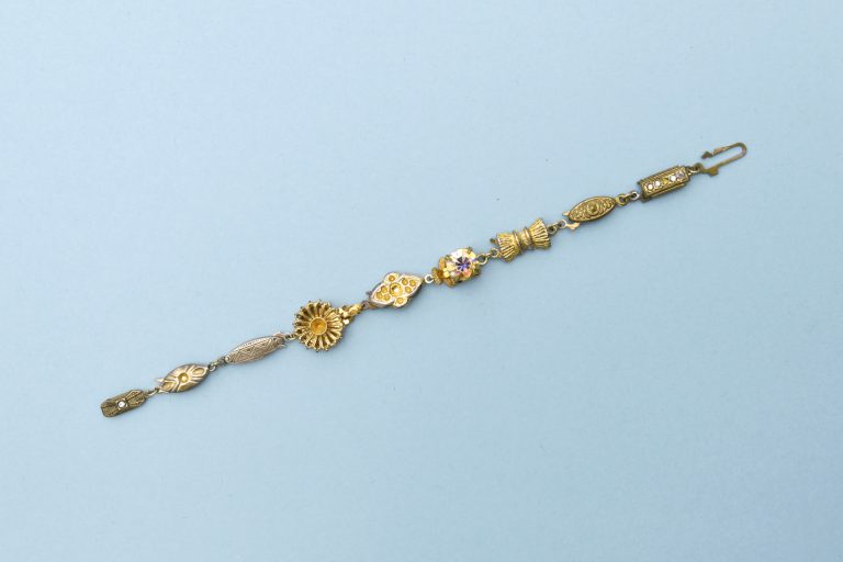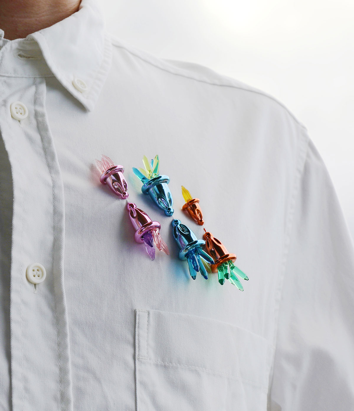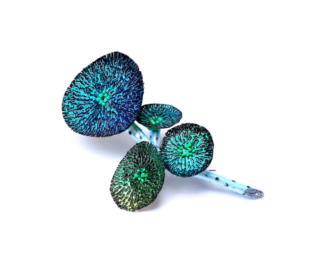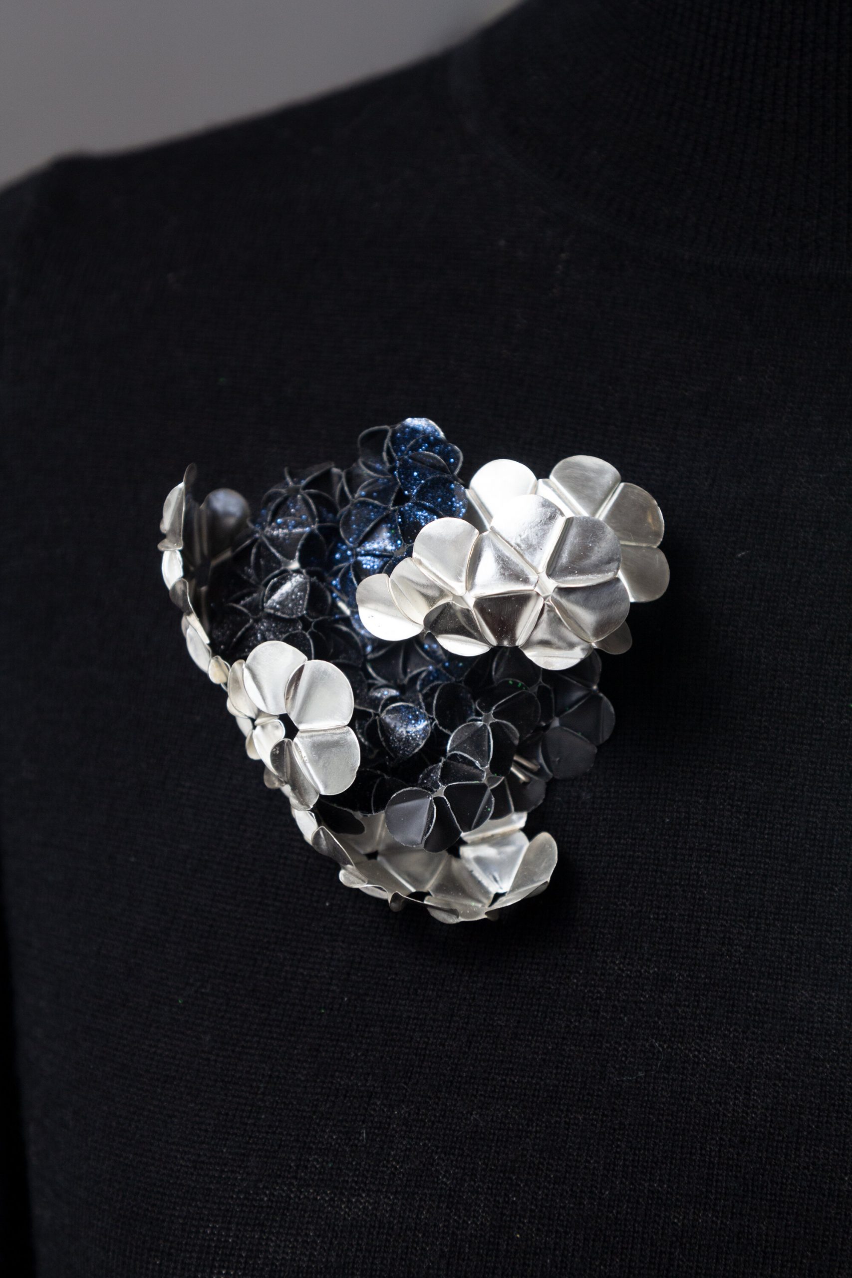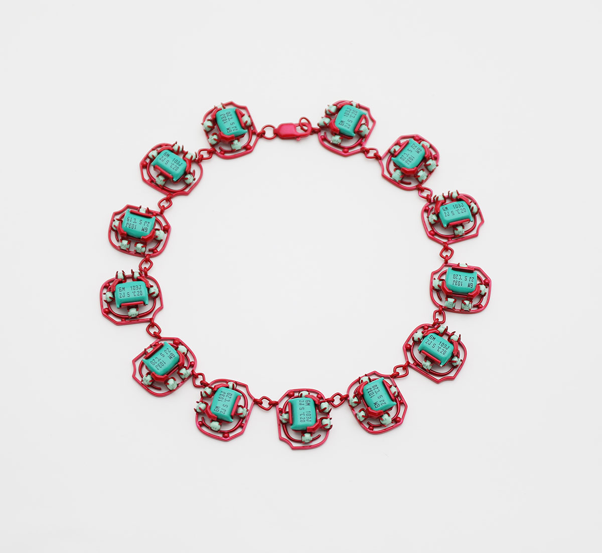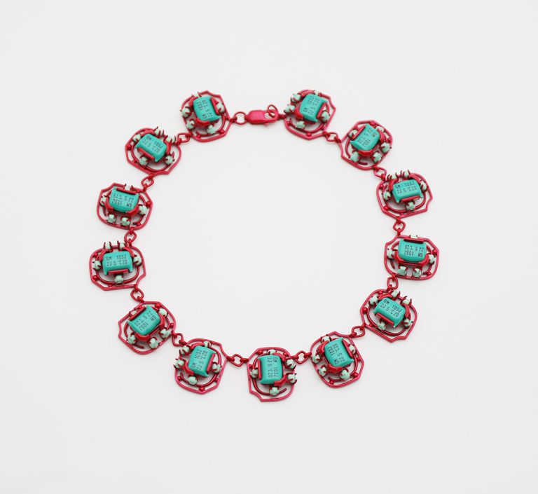 Fermoirs anciens agencés en bracelet contemporain ; tessons, fèves ou santons de céramique ressuscités en ribambelles : l’idée de collection s’encanaille et élargit sa définition. Surfaces iridescentes assemblées en créatures mutantes ; parures éblouissantes jaillies d’un presque rien ; filaments de flacons noués en dentelle : l’ancien se réinvente, entre modèles de jadis et structures du futur. Composants électroniques sertis d’argent recyclé et teinté : le principe du joyau, repensé, entre dans une ère neuve.