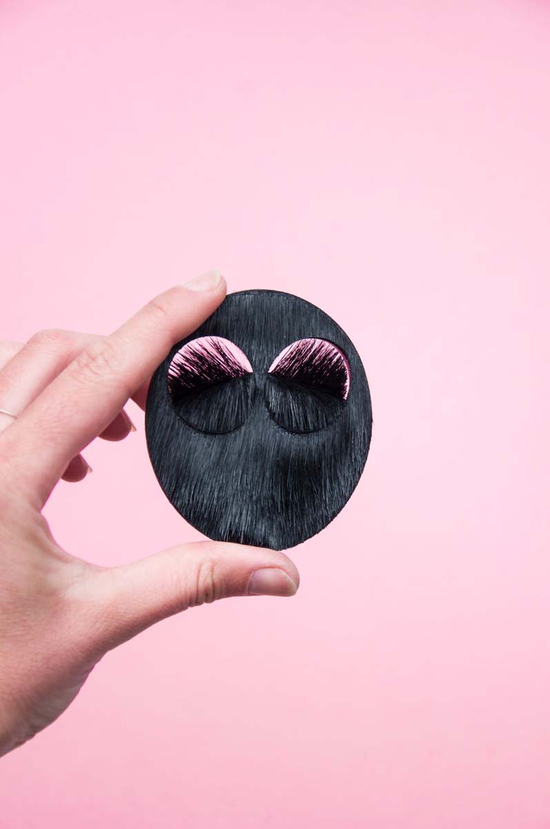 Zwarte leren broche die werkt met een zeer sterke magneet. Prachtig in de winter op een zwarte trui voor een camouflage-effect of in de zomer op een spijkerjasje.