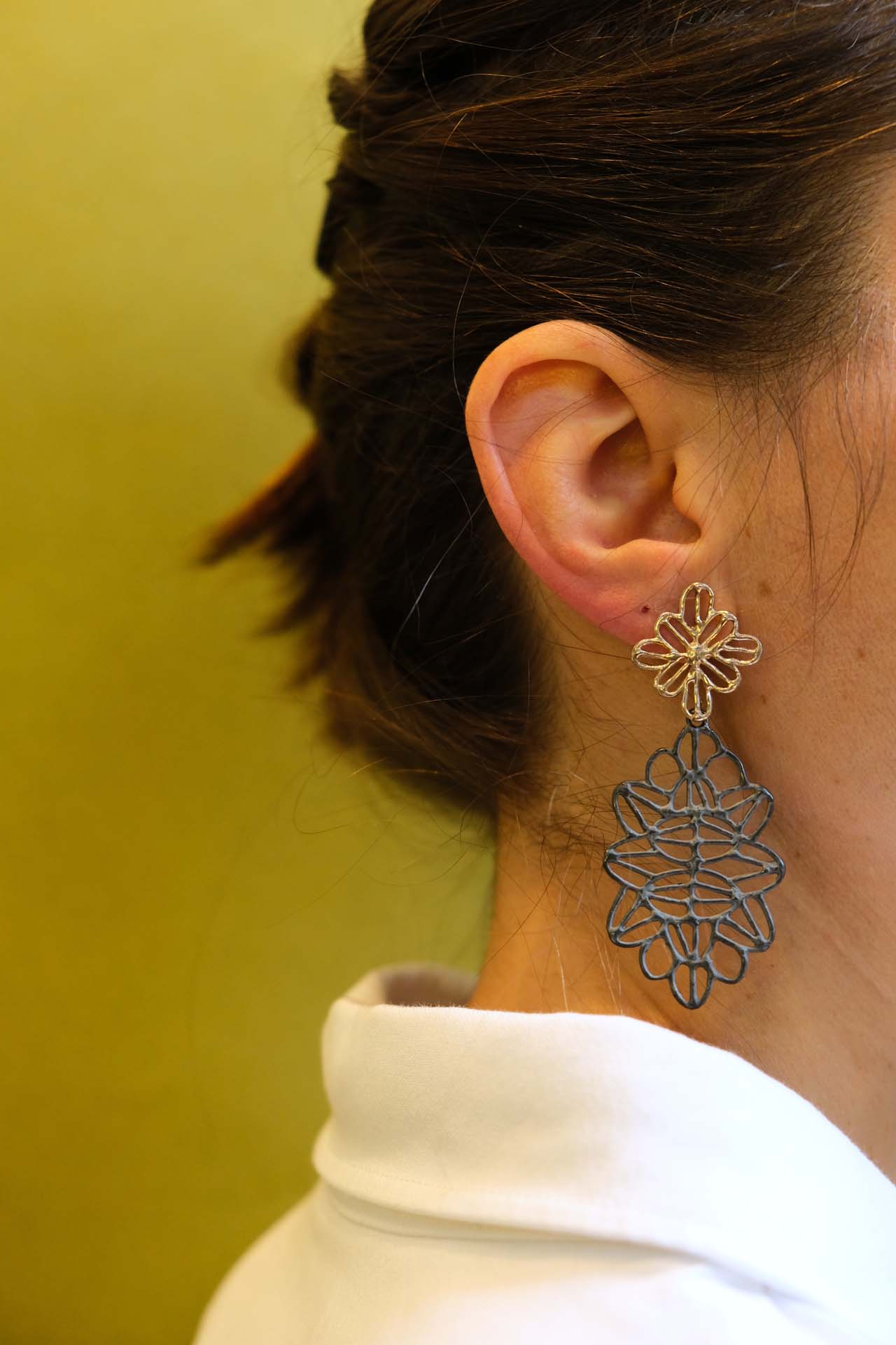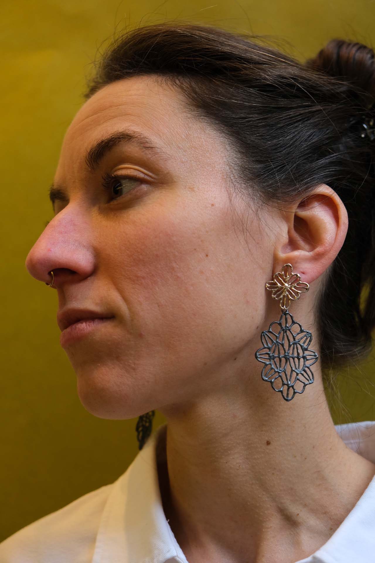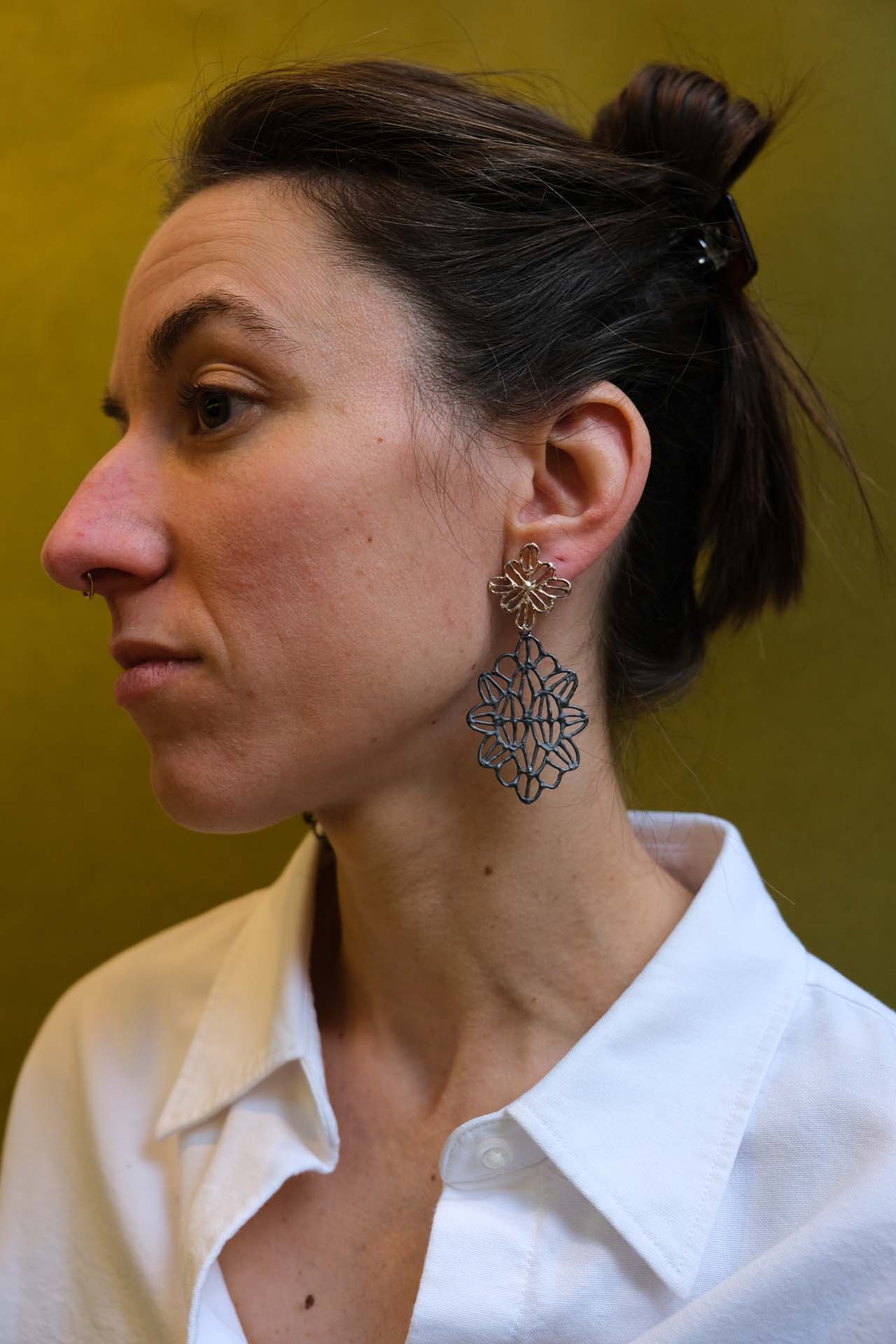 Ces boucles d’oreilles en argent se distinguent par leur mobilité et leur jeu de contrastes : une partie en argent lumineux, l’autre subtilement oxydée de noir. L’ensemble crée un mouvement délicat et une profondeur visuelle raffinée, entre lumière et ombre.