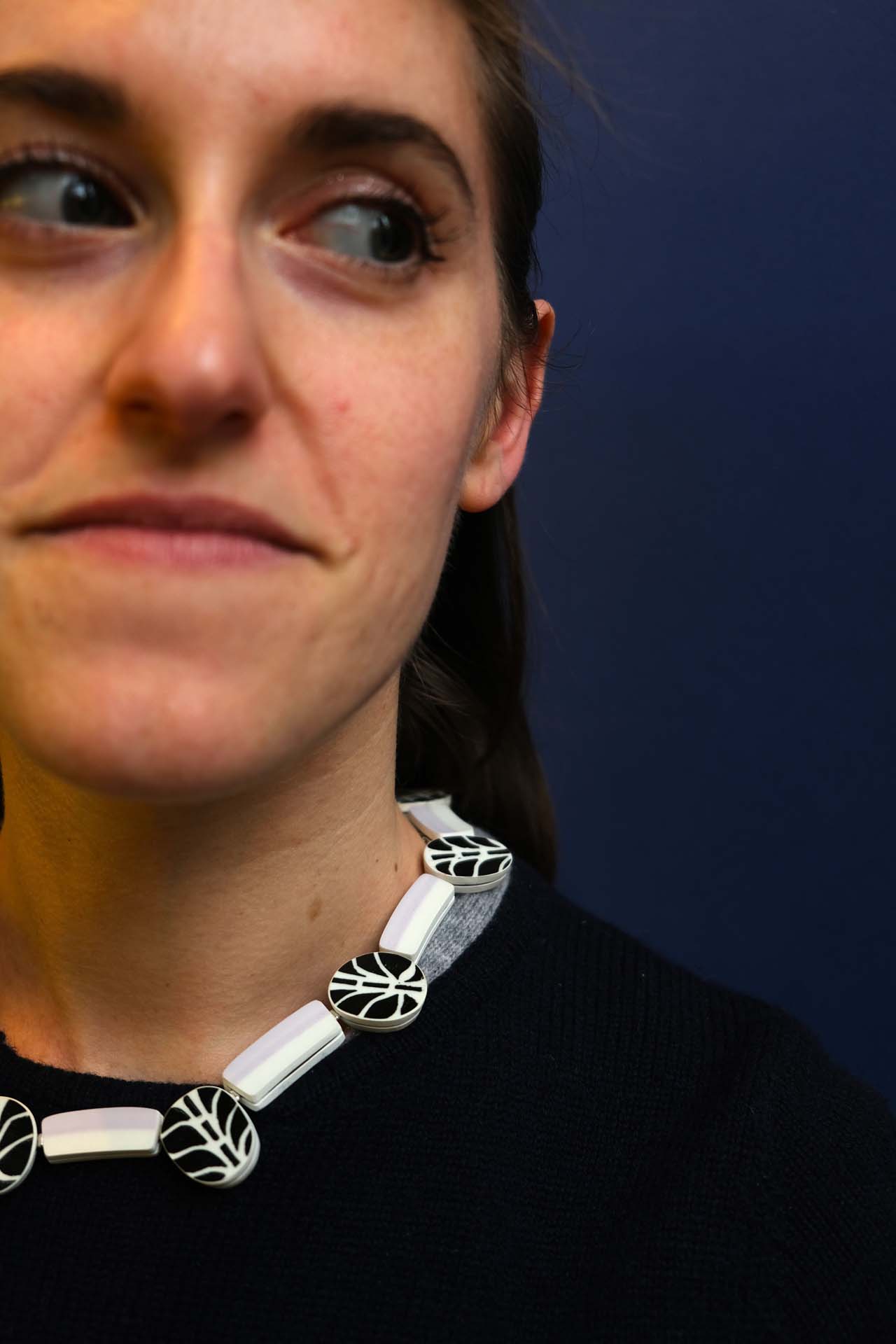 Julie Decubber – Collier Noir blanc mauve céramique