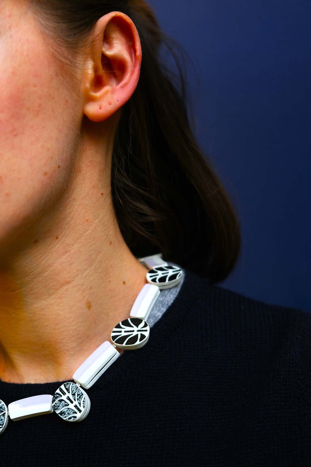 Ce collier en céramique associe des nuances de violet, de noir et de blanc dans une composition graphique et sensible. Les contrastes de couleurs et la texture de la matière confèrent à cette pièce une présence forte, à la fois contemporaine et poétique.